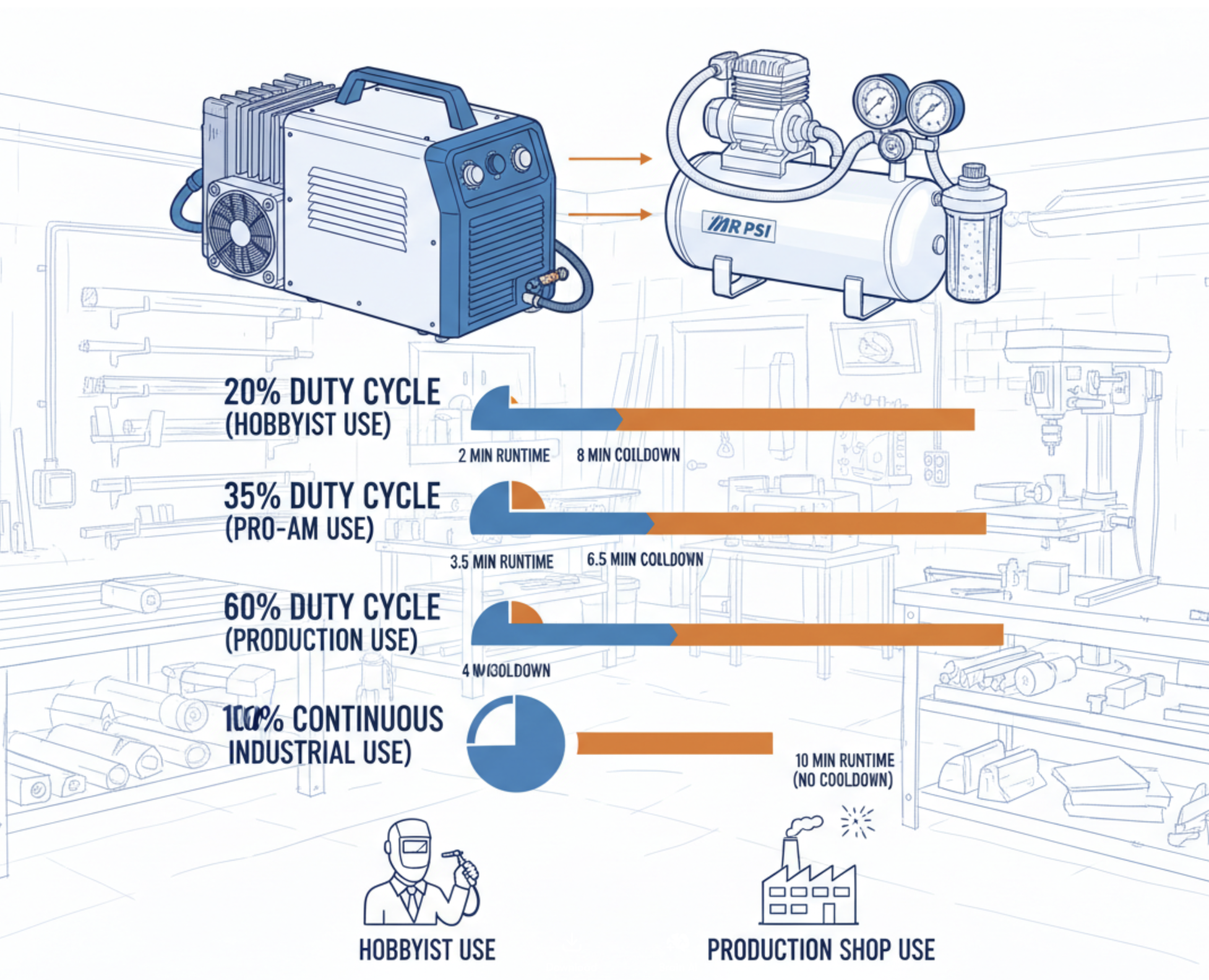 At lower amperage: Duty cycle increases (50A cutter at 30A may have 60-80% duty cycle).