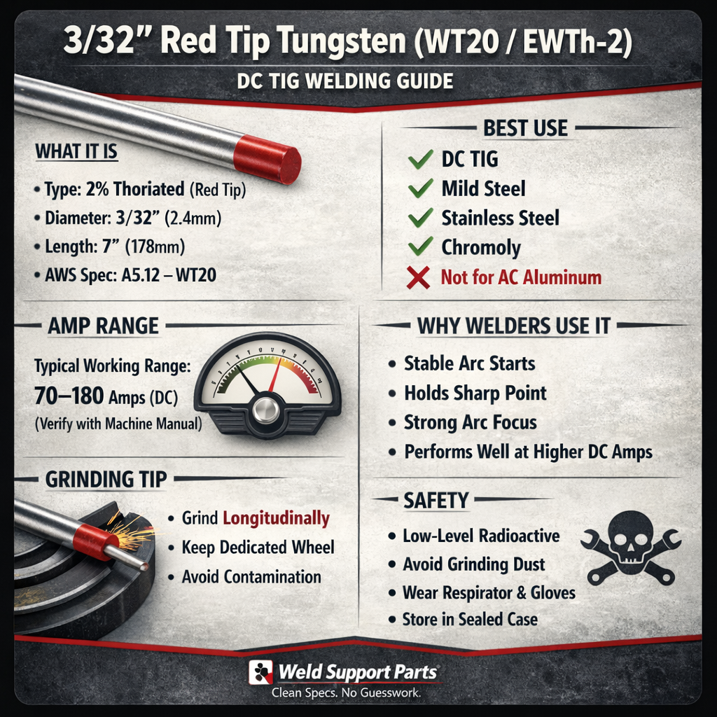 Selecting the correct tungsten electrode directly affects arc stability, weld appearance, and electrode life. 3/32″ 2% thoriated (WT20/EWTh-2) is a long-time standard for DC TIG welding on steel and stainless. Here’s what matters before you buy.